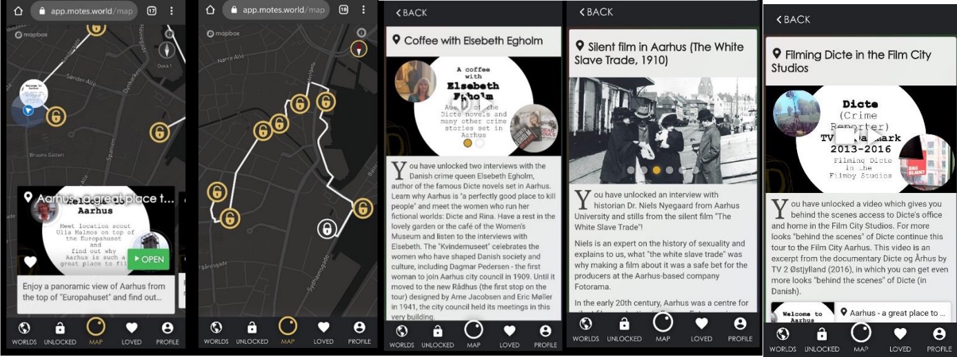 The app offers a choice of different clusters and themed tours of audiovisual stories they can “unlock” when standing in a specific location. These stories are called “Motes”. To use the app, tourists have to be in Aarhus but can assemble their tour at their own leisure. Each Mote adds a specific layer of meaning to the physical space the tourist is located in. Tourists can interact through “loving” a Mote. At this stage no social media features have been implemented, because in Motes’ experience from other tours, this is not a feature users desire. We have, however, suggested a feature that users can ‘share’ that they have completed the tour on social media, in order to create more visibility for the app.