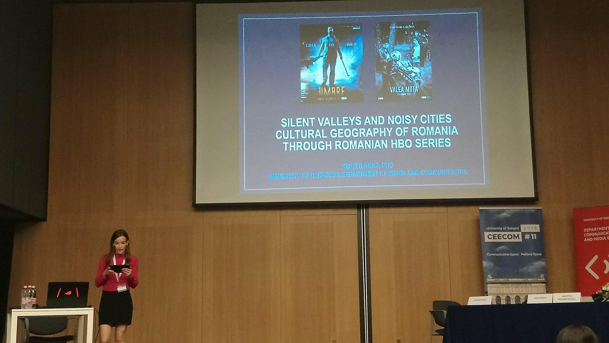 The title of Keszeg Anna’s paper was Silent Valleys and Noisy Cities: Cultural Geography of Romania through Romanian HBO Series (in absence of Anna, it was read by Molnár-Kovács Dorottya who also participates in DETECt research). Keszeg analysed how space is invested by production value in the opposing spatial structures of two Romanian series, Umbre (2014) and Valea Mută (2016). In Umbre (Shadows) a double-faced Bucharest allows the central character to have a double identity connected to the diurnal and the nocturnal city. Moreover, the two professions of Relu, the protagonists, are mightily anchored in space: in his ordinary life he is a taxi-driver, while during the night he works as collector for a local mobster. Consequently the complex nature of the hero assures the reinvestigation of the classic opposition between underworld and mainstream society, which was the object of crime fiction from its early origins. Similarly, Valea Mută (Silent Valley) explores another traditional spatial opposition between urban and rural realities investigating exactly how crime produces the counter-myth of the transparent sylvan society. Following the methodology of social representation theory this research tried to prove that crime is connected to place in a synchronic way in the latter and in a diachronic way in the former case.