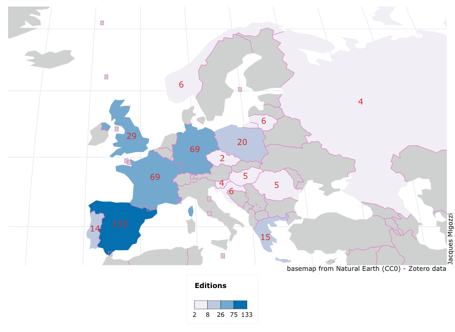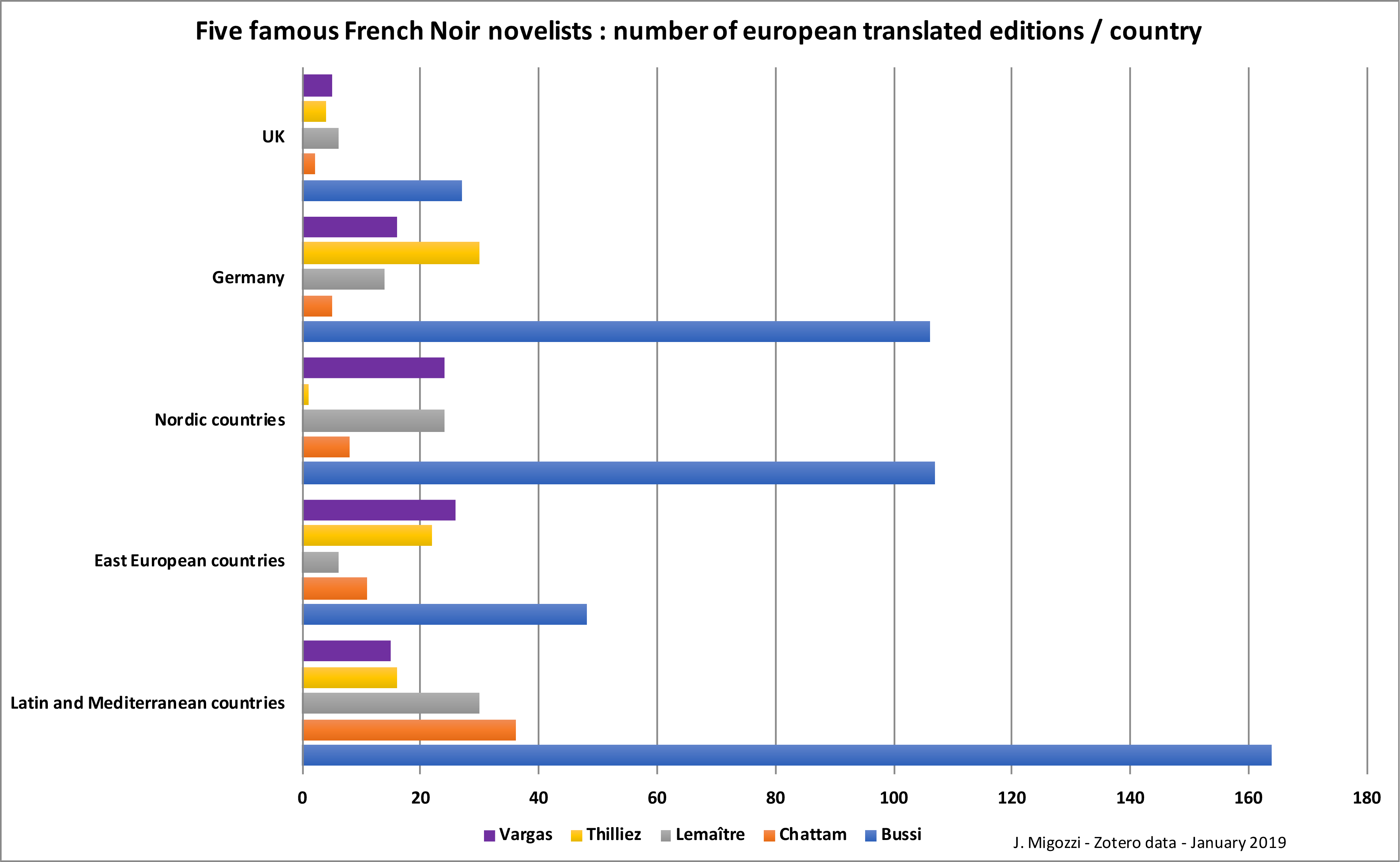 The map and graph visualise the number of translations of Camilleri’s novels in different countries, and compare it to those of other European authors.