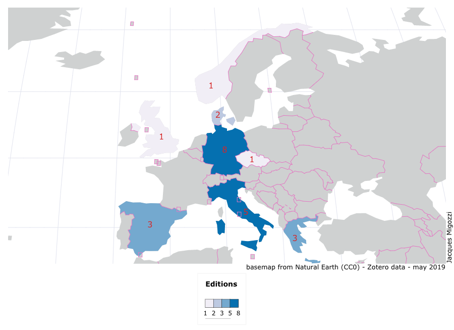 The data in this map have been collected from the online catalogues of European national libraries using Zotero.