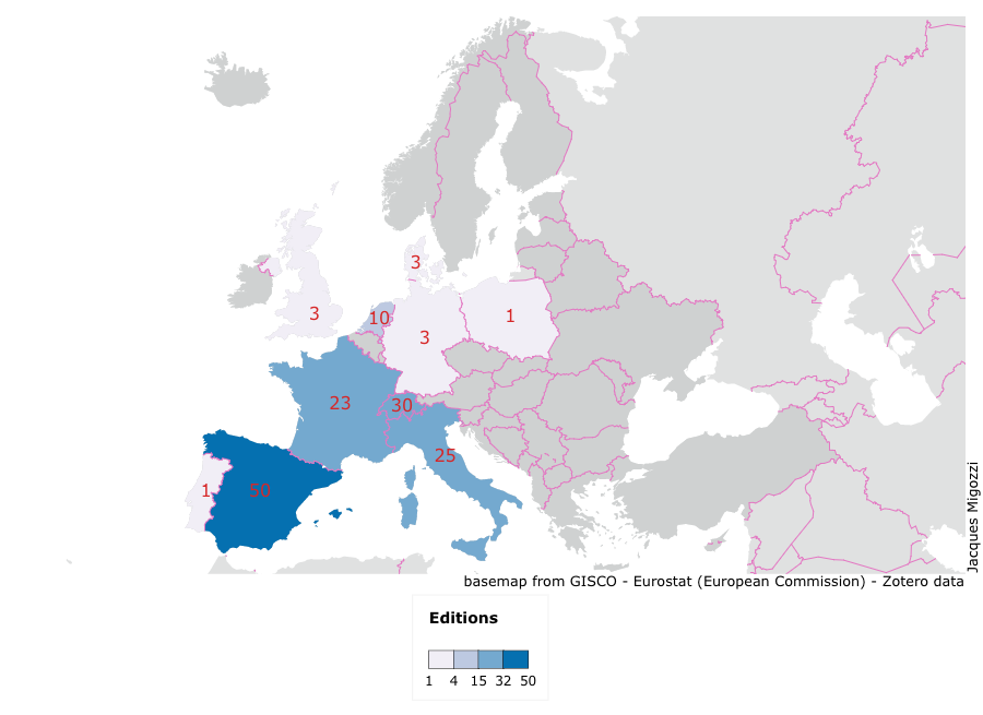 The data in this map have been collected from the online catalogues of European national libraries using Zotero.