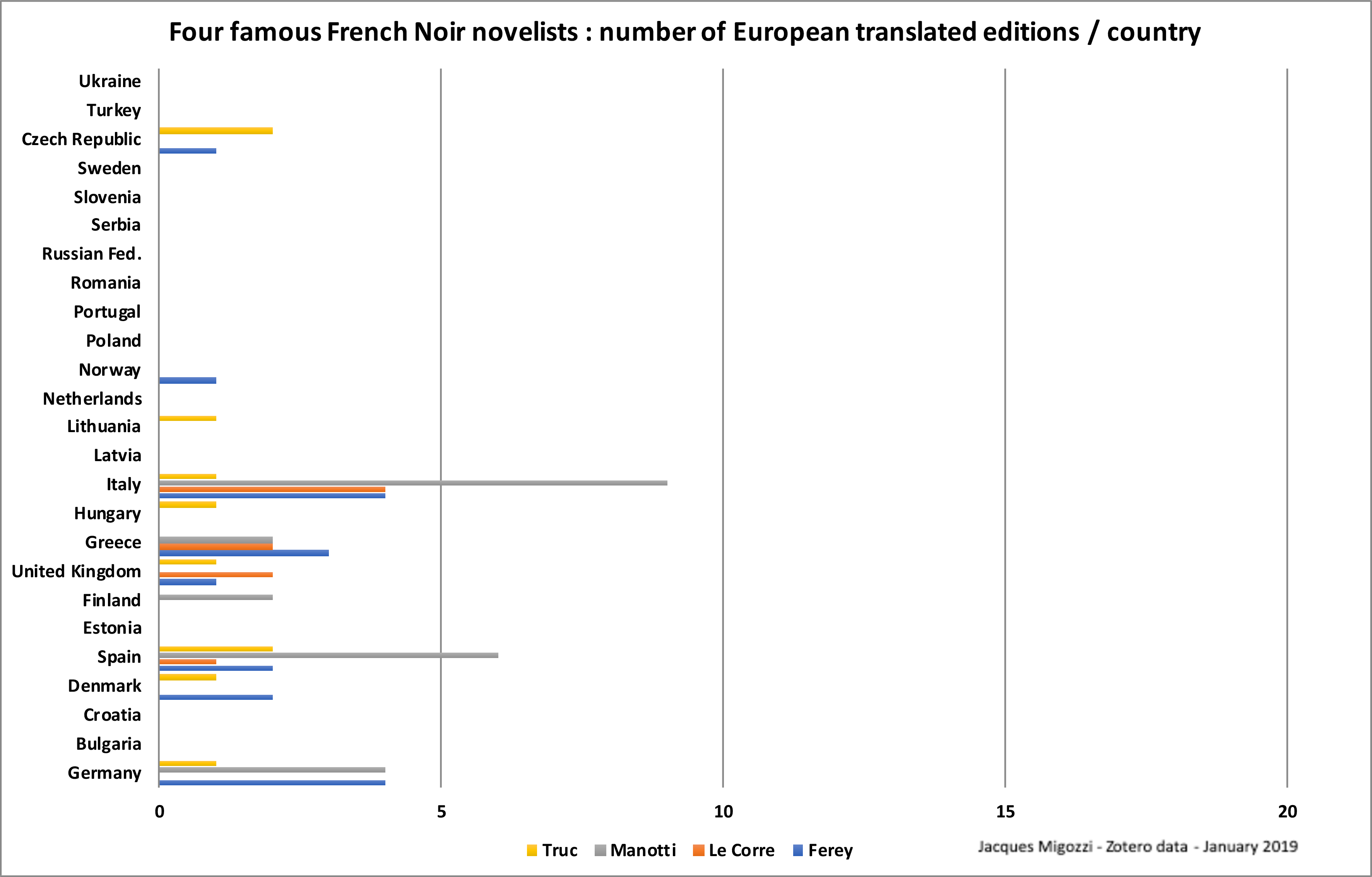 The data visualised in this page refer to the transnational circulation of his literary works, detailing the number of translations of his novels and comparing them to those of other contemporary French and European crime writers.