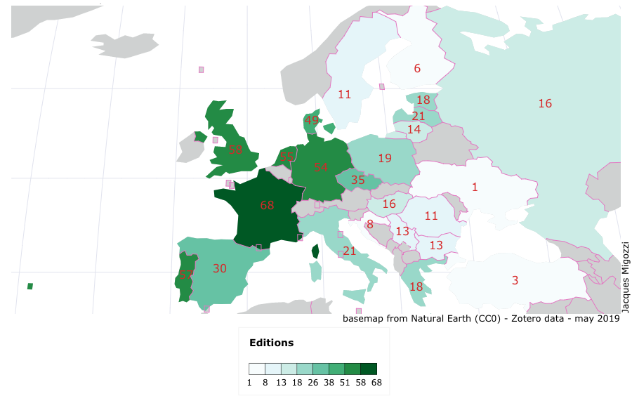 The data in this map have been collected from the online catalogues of European national libraries using Zotero.