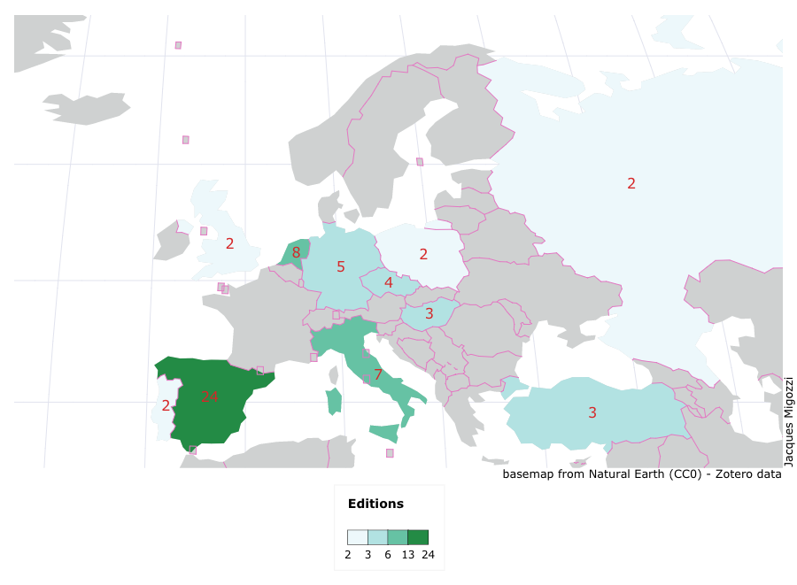 The data in this map have been collected from the online catalogues of European national libraries using Zotero.