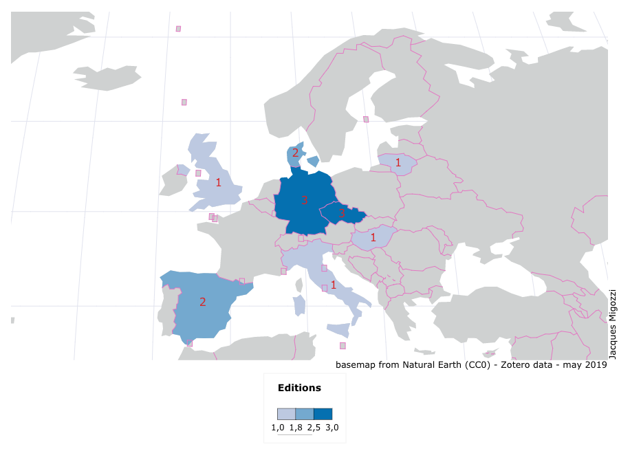 The data in this map have been collected from the online catalogues of European national libraries using Zotero.