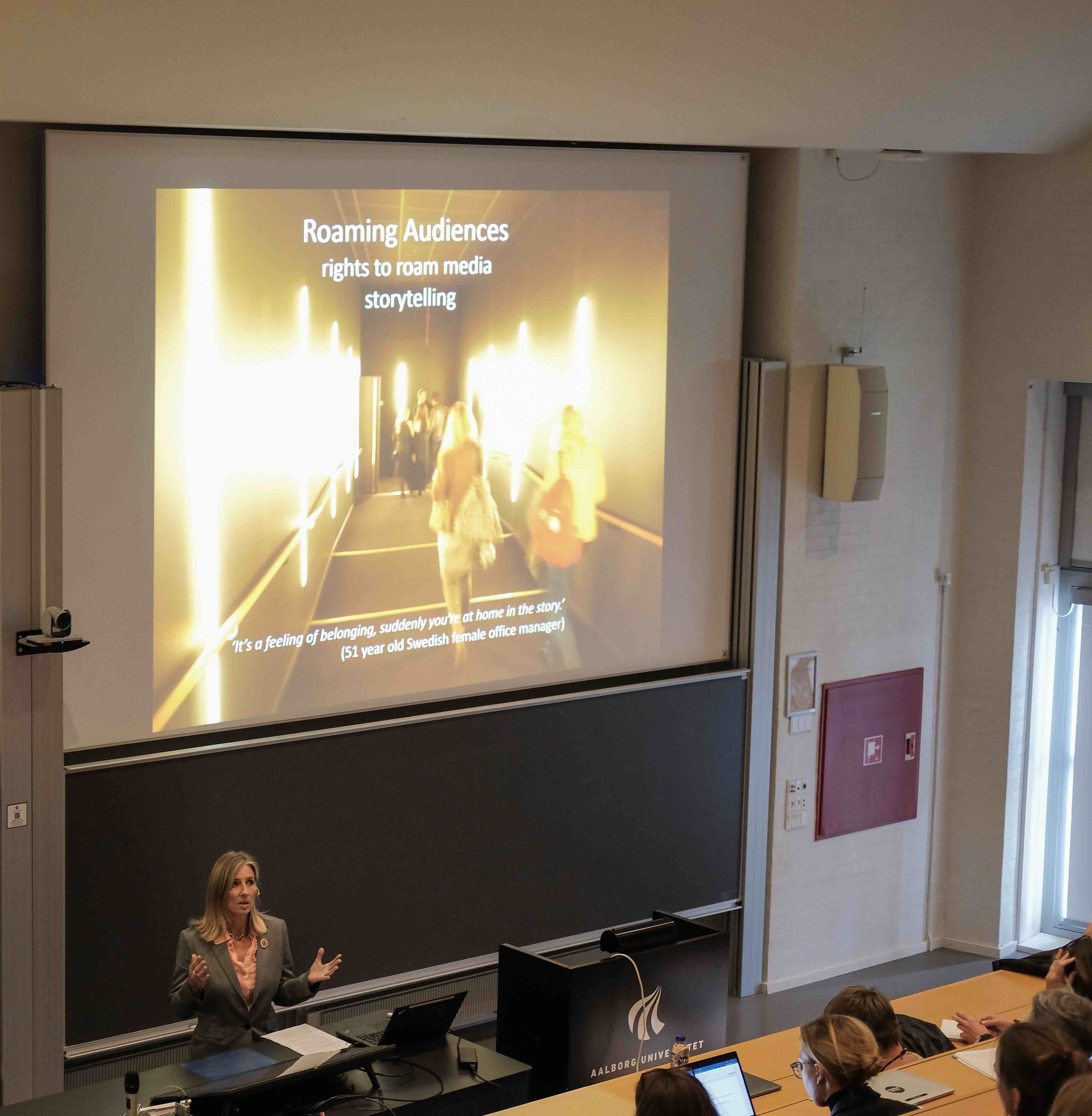In the afternoon keynote, Annette Hill, Professor of Media and Communication at Lund University in Sweden and visiting Professor at King’s College in London, introduced her concept of “Roaming Audiences”, which will also be the focus in her upcoming book. She started with explaining what “roaming” means for her in relation to Nordic Noir. Rather than seeing audiences as “nomadic”, Annette Hill argued we should conceptualize them as roamers around stories, media and storyworlds. She explored the different ideas of “rights to roam” in societies, relating to the right of way through the landscape. Applying this idea to media, she argued that audiences roaming between stories also means shaping collectives’ ways through media. However, freedoms of roaming can today also be restricted by legal means such as geo-blocking, which are limits that media roamers subvert through illegal media sharing, hence making their own paths through the media landscape. She highlighted that people now have “roaming expectations” about how they can engage with media and share them.